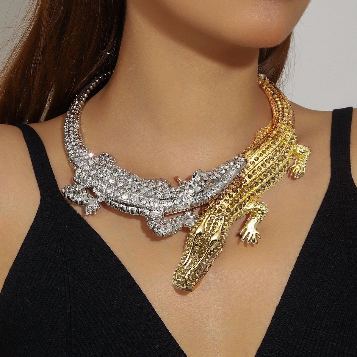 Alloy Maximelism Style Alloy Full Diamond Big Crocodile Necklace Animal Series Large Gecko Choker