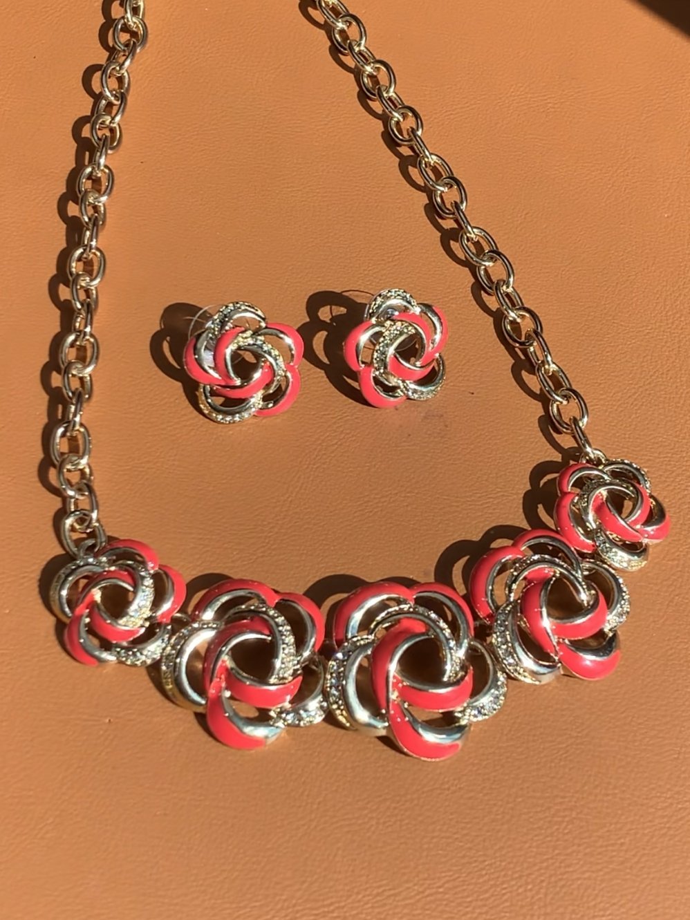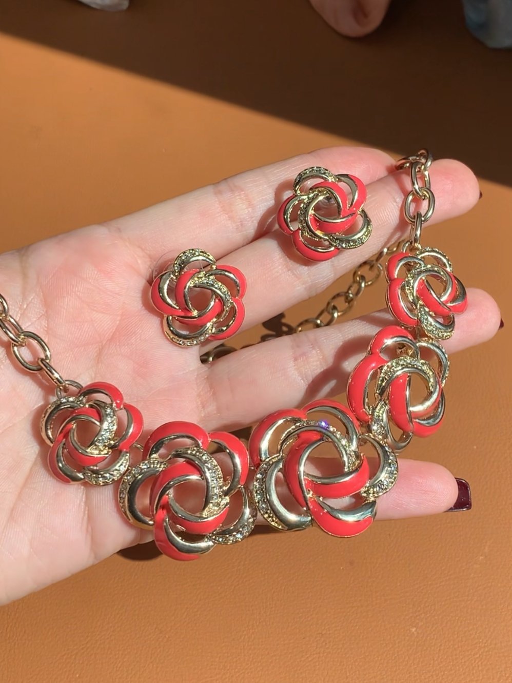 Alloy Red Enamel Flower Stud Earrings Necklace Set Rhinestone Inlaid