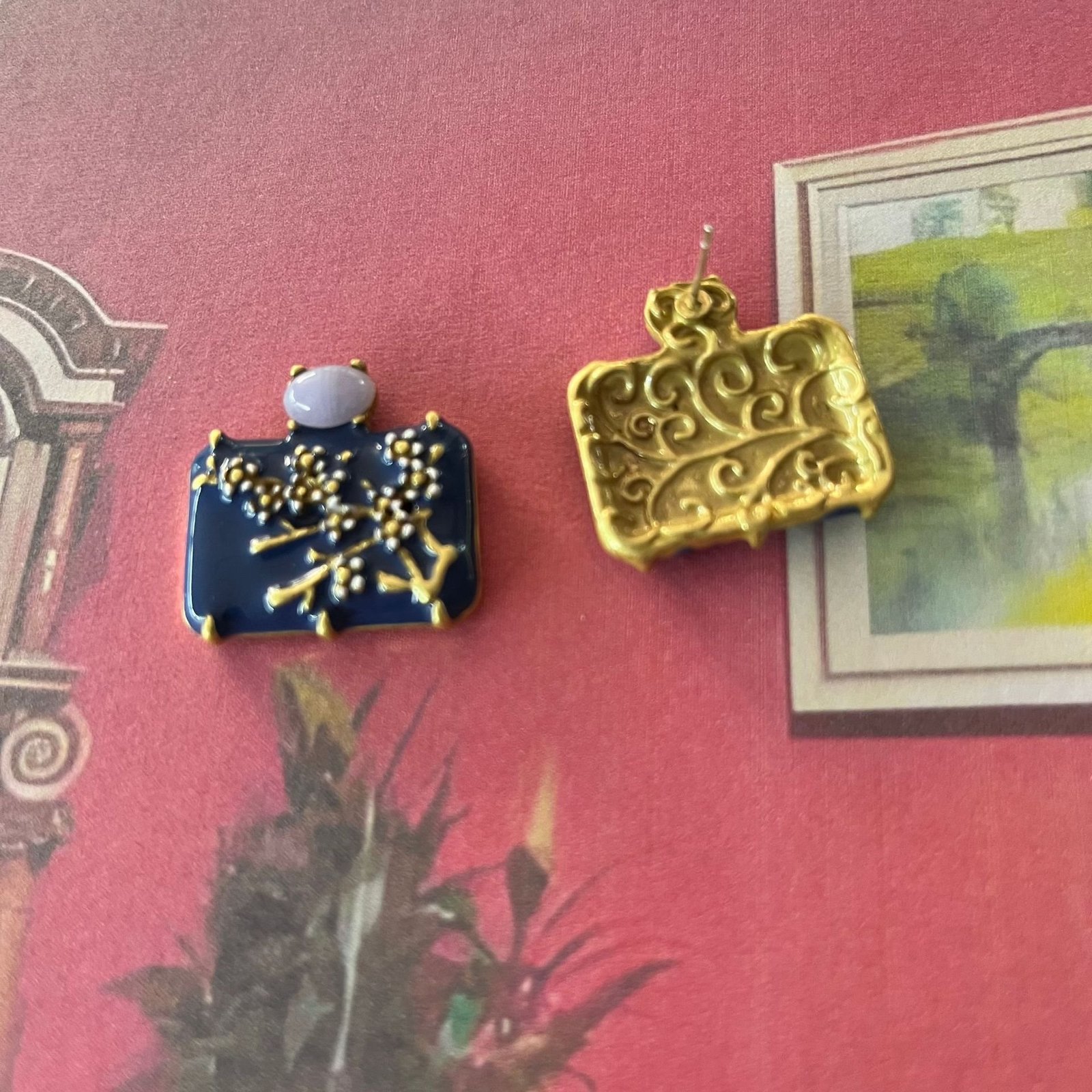 Chinese Style Enamel Color Flower Square Shape Stud Earrings Red / Yellow