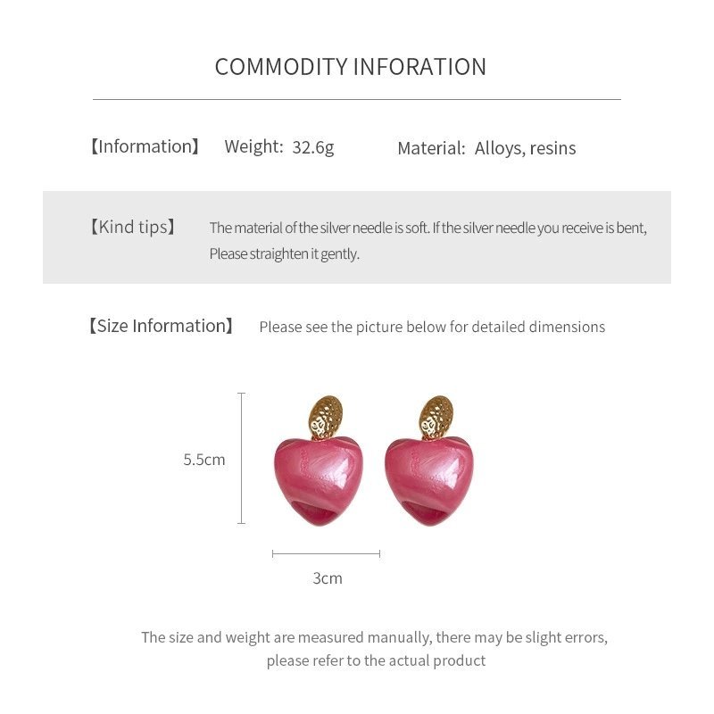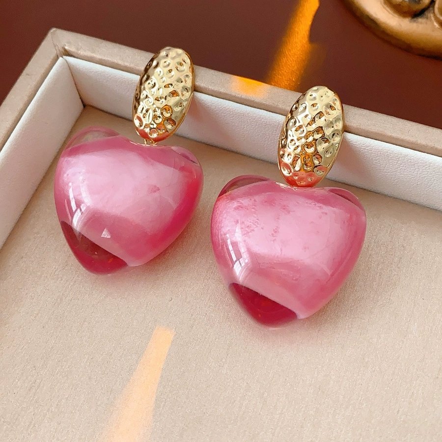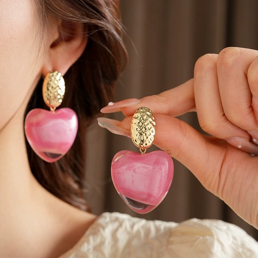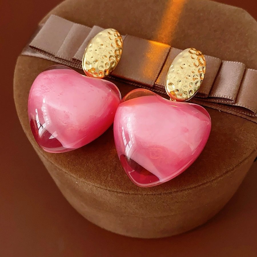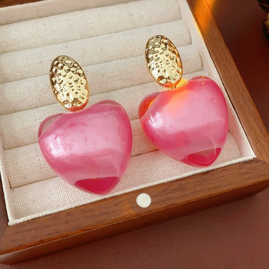 Big Dangle Earrings Rhinestone Inlaid Resin Pink Heart Shape