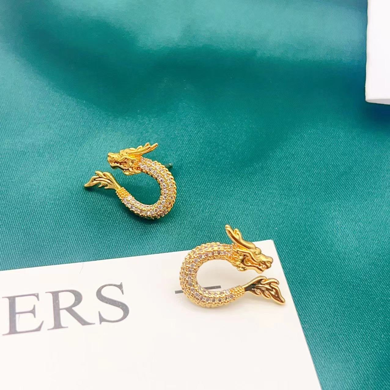 Diamond-Studded Dragon Earrings, Copper-Plated Gold