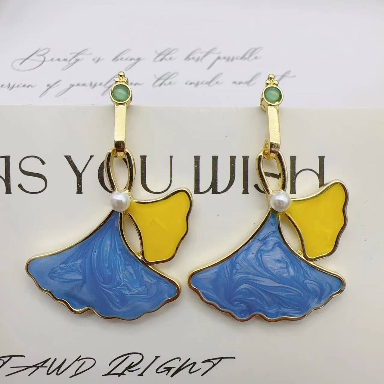 Ginkgo Shape Blue And Yellow Drip Glaze Earrings quantity