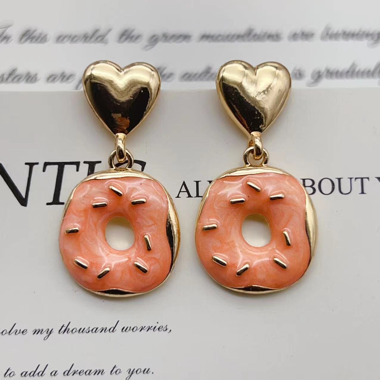 Gold Love Heart Pink Orange Donut Earrings Enamel Glaze quantity