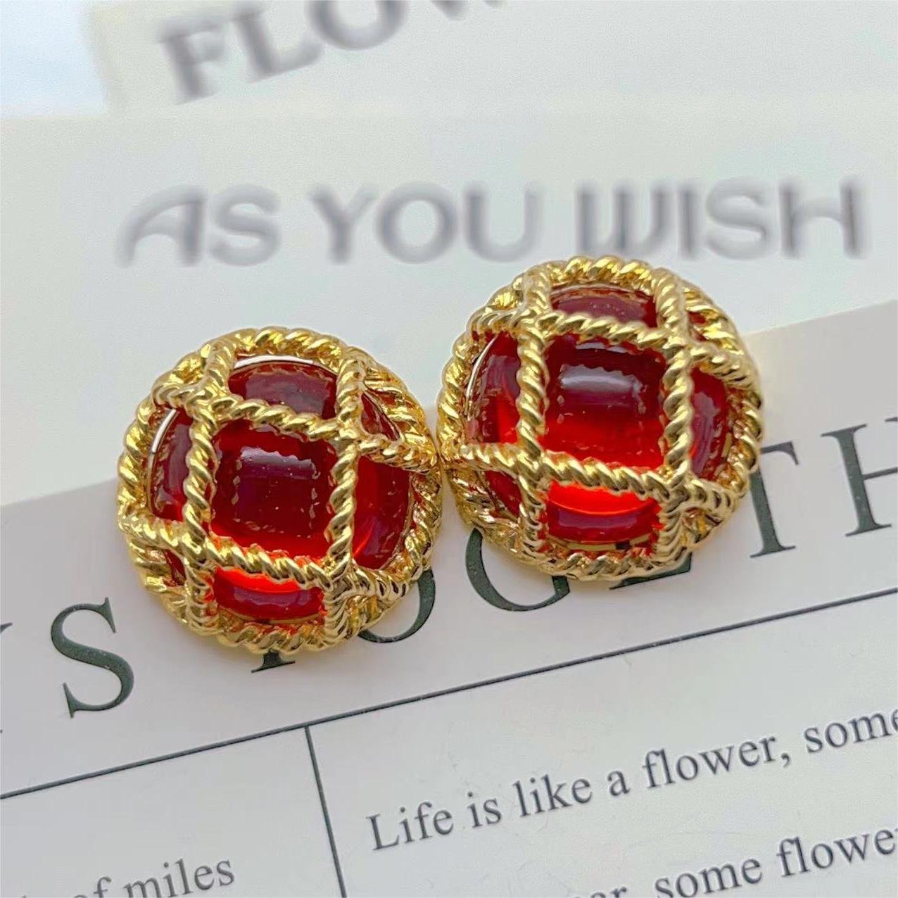 Hollow Three-Dimensional Checkered Semicircular Red Resin Earrings