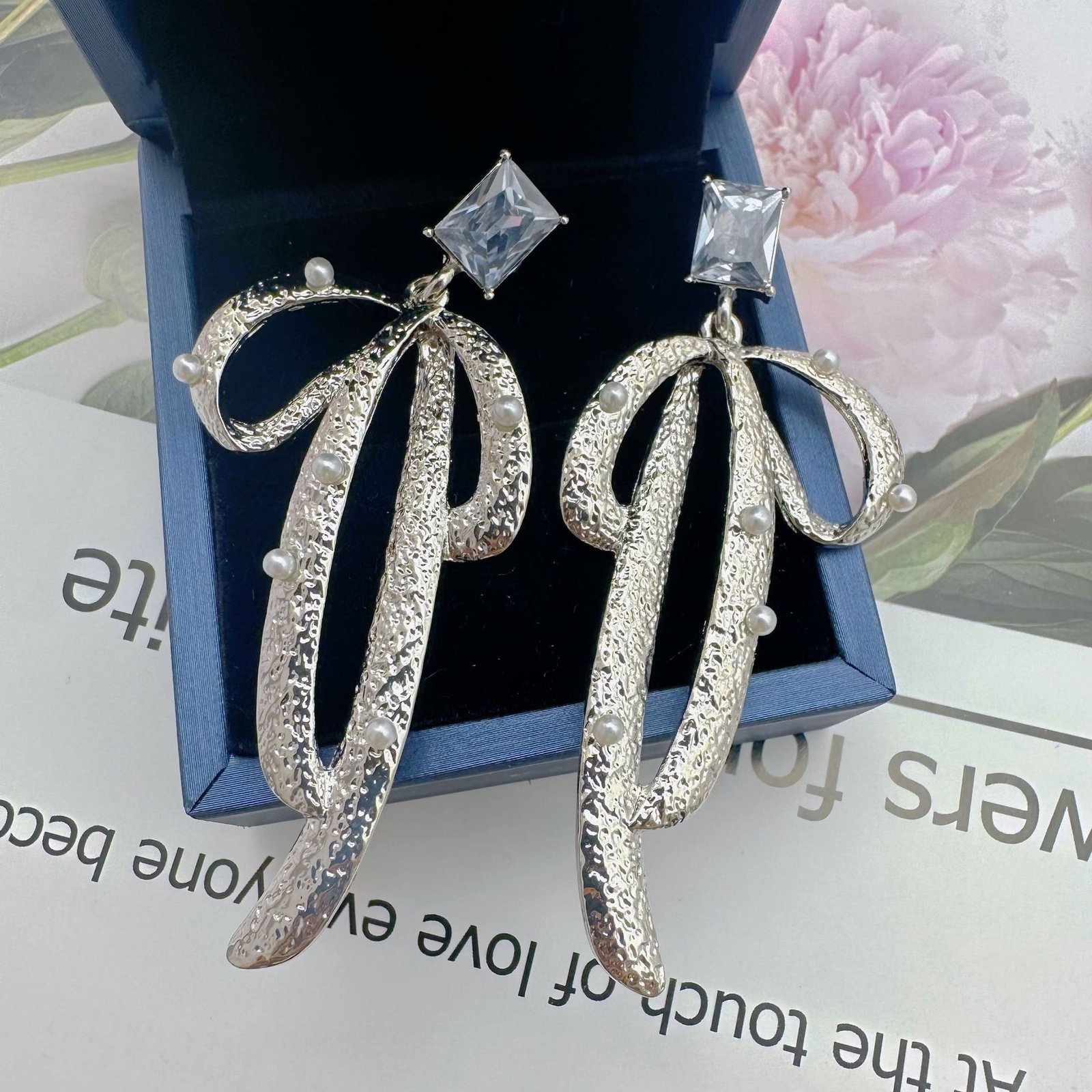 Ribbon-Style Bow Imitation Pearl Blue Zircon Inlaid Earrings