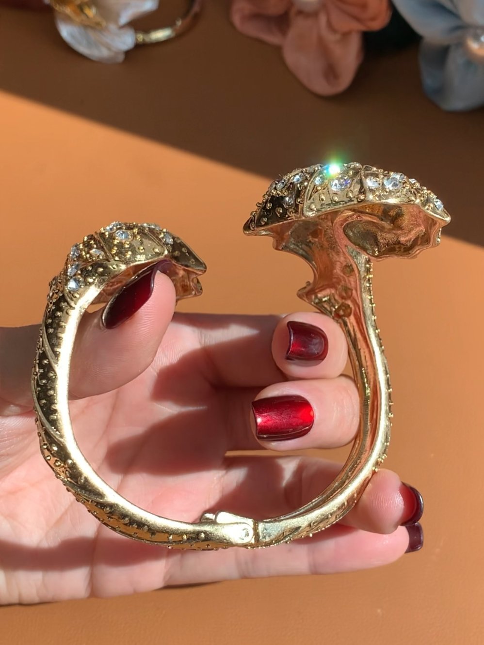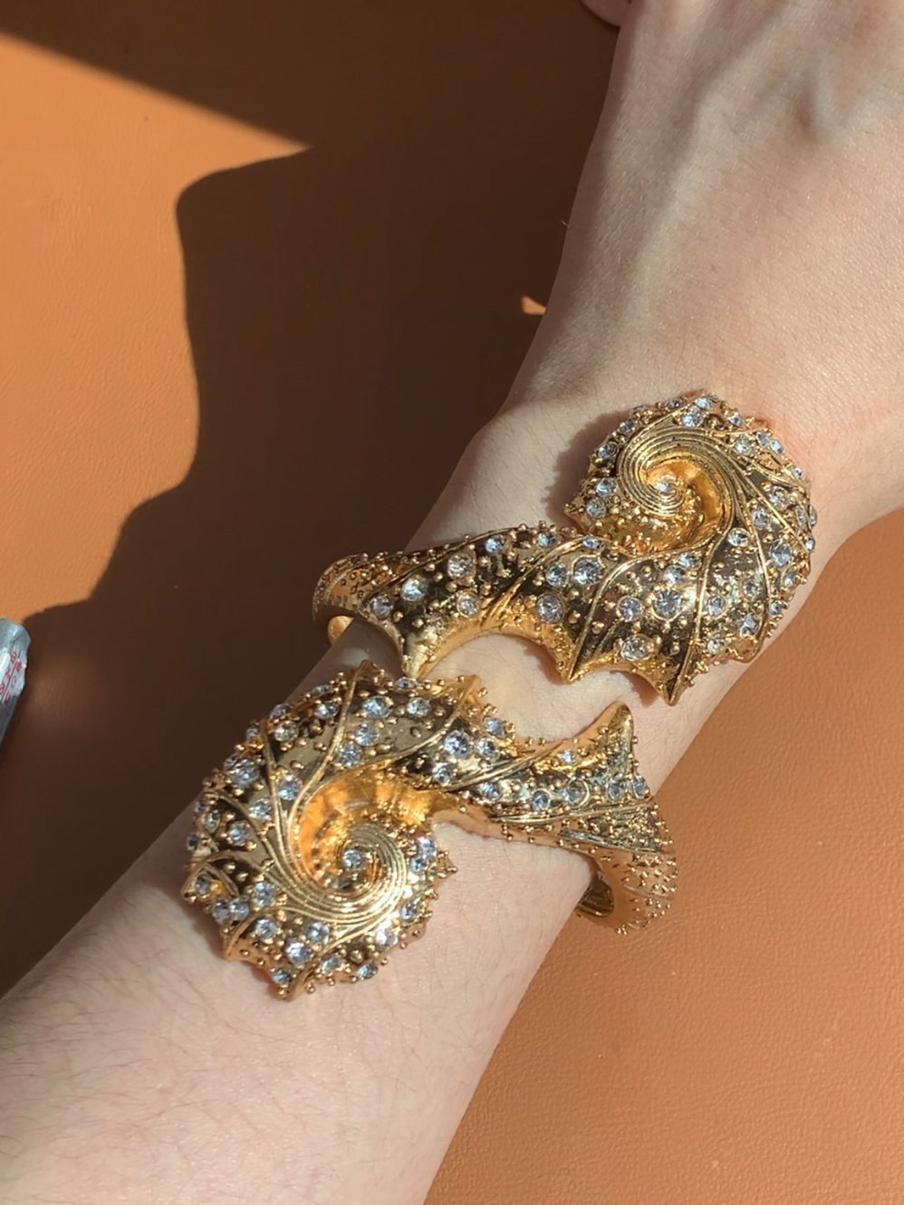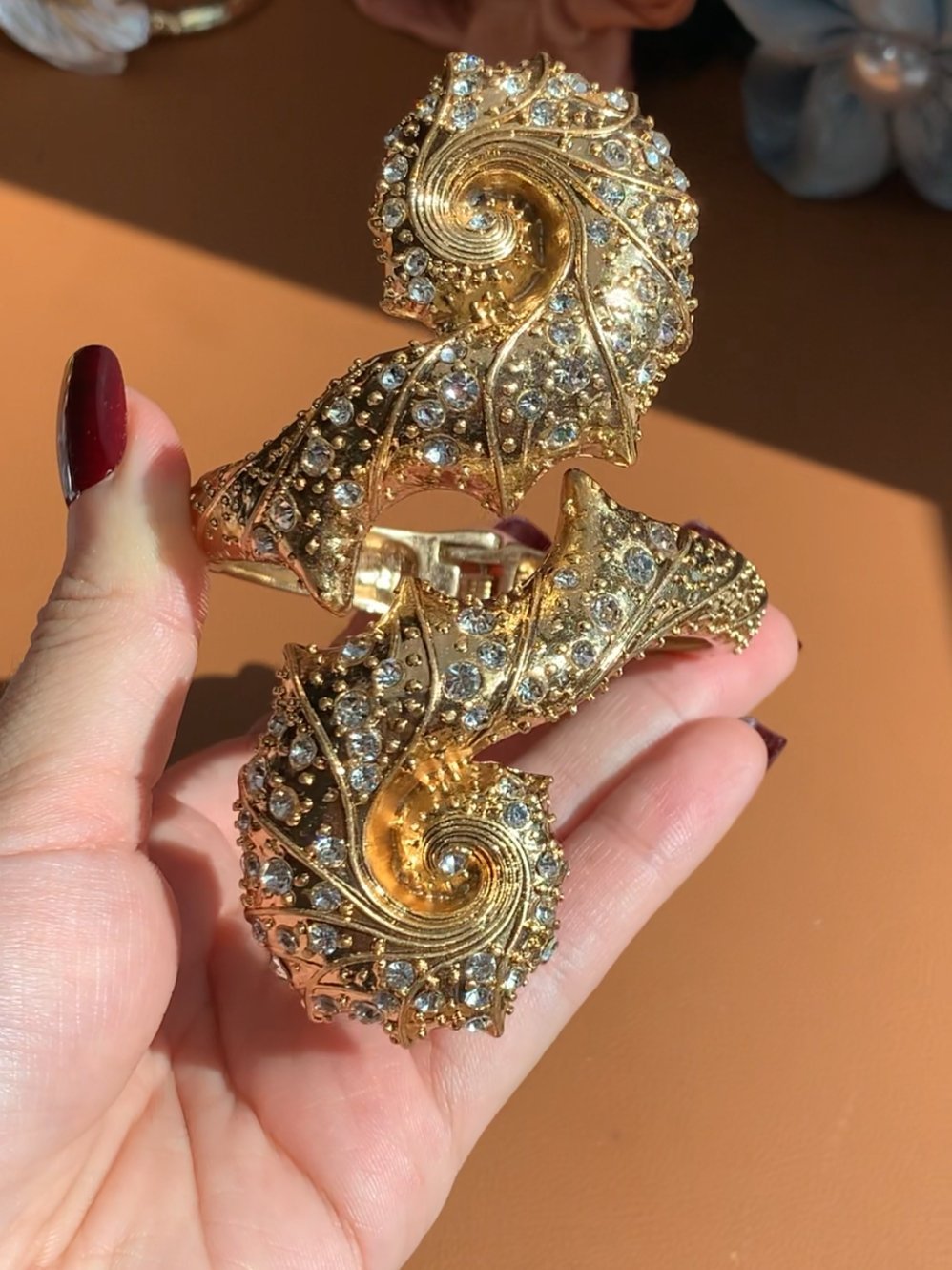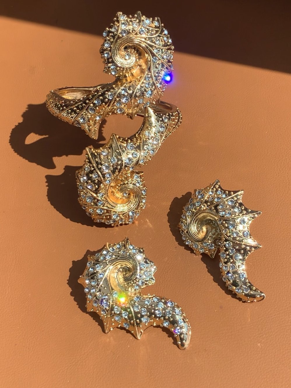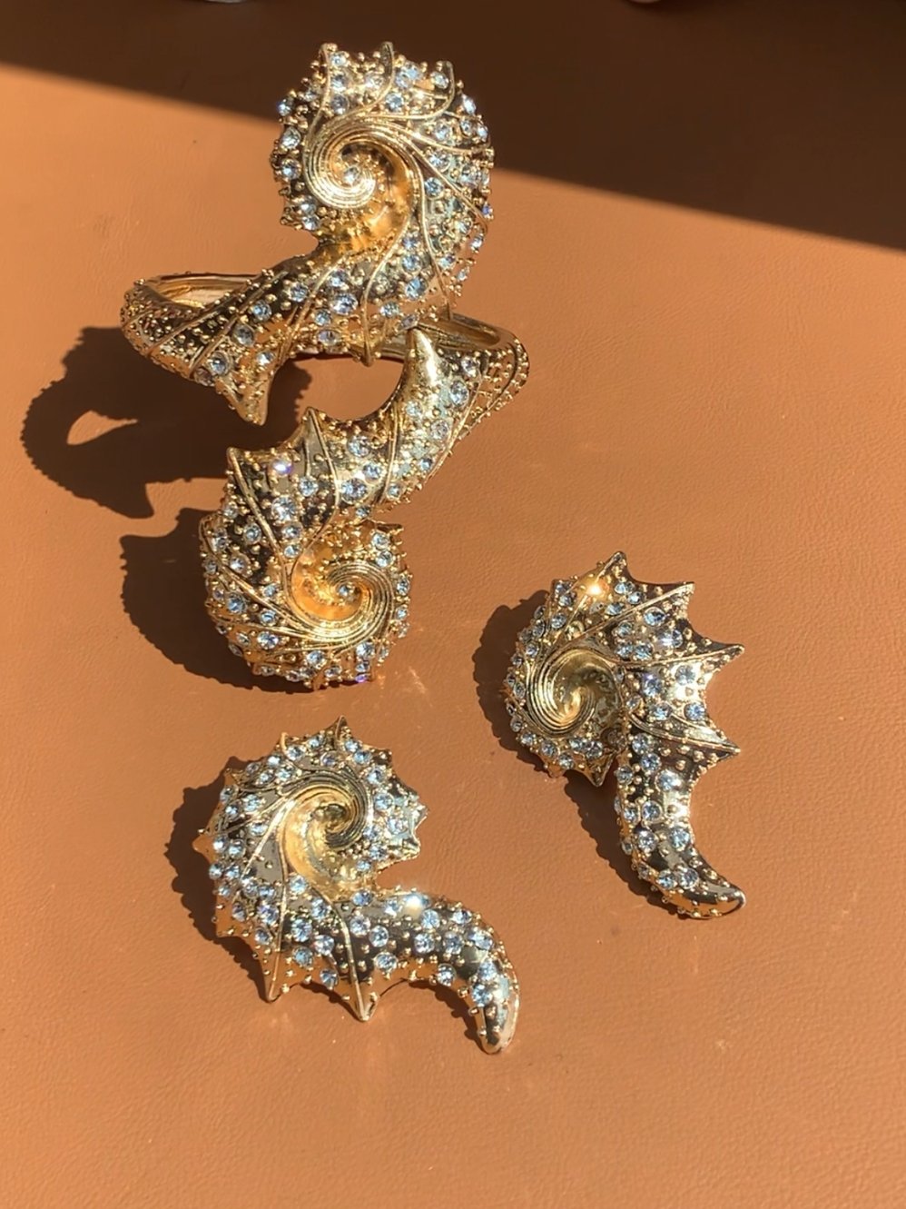 Sparkling Rhinestone Inlaid Maximelism Style Open Size Cuff Shell Shape Bangle / Sea Shell Stud Earrings