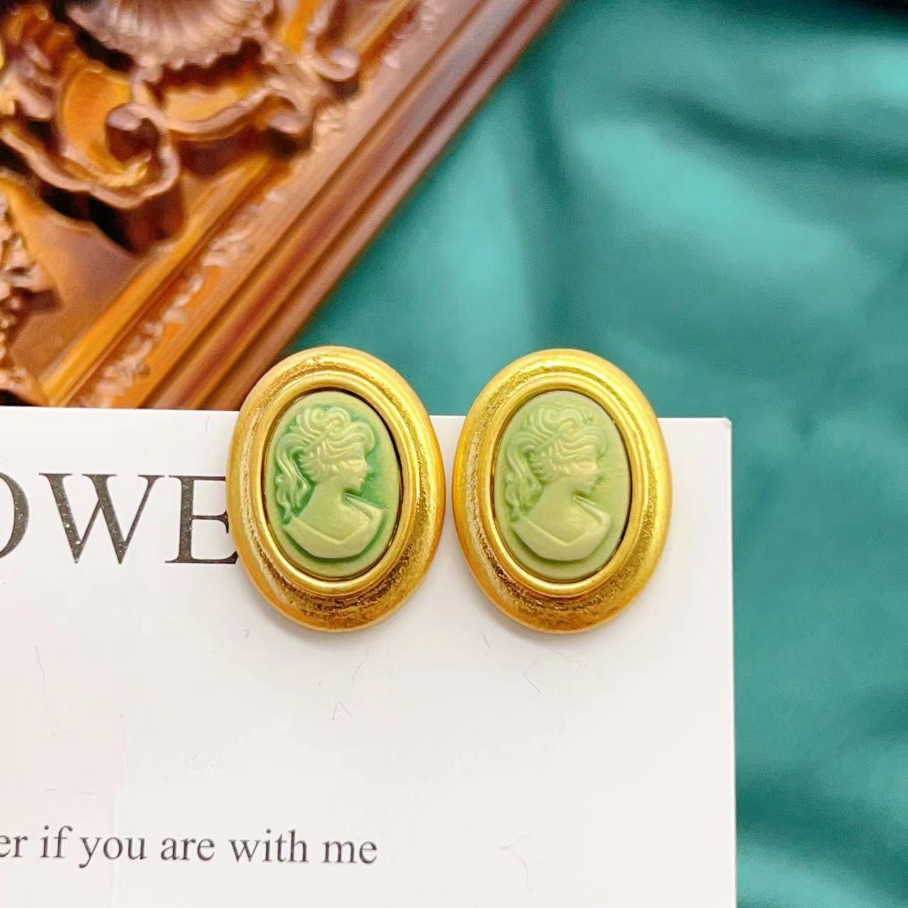 Vintage Copper-Gilt Green Goddess Head Earrings quantity