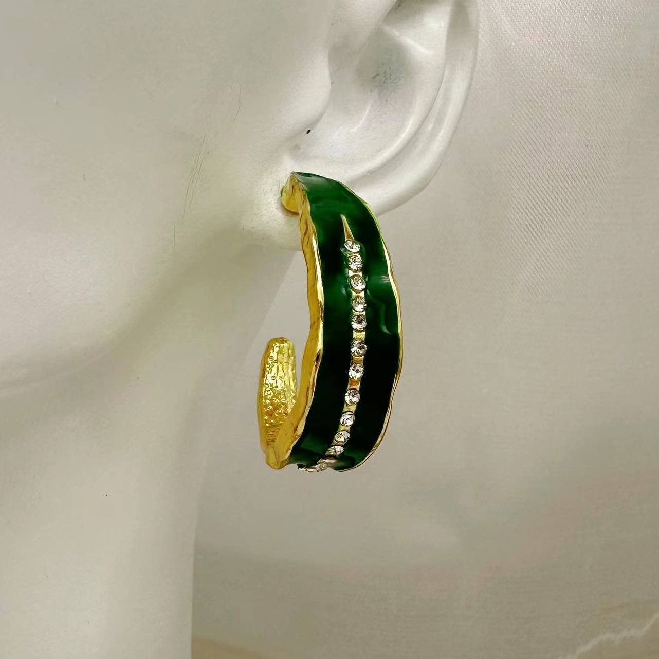 Vintage Dark Green C-Shaped Leaf Diamond Earrings