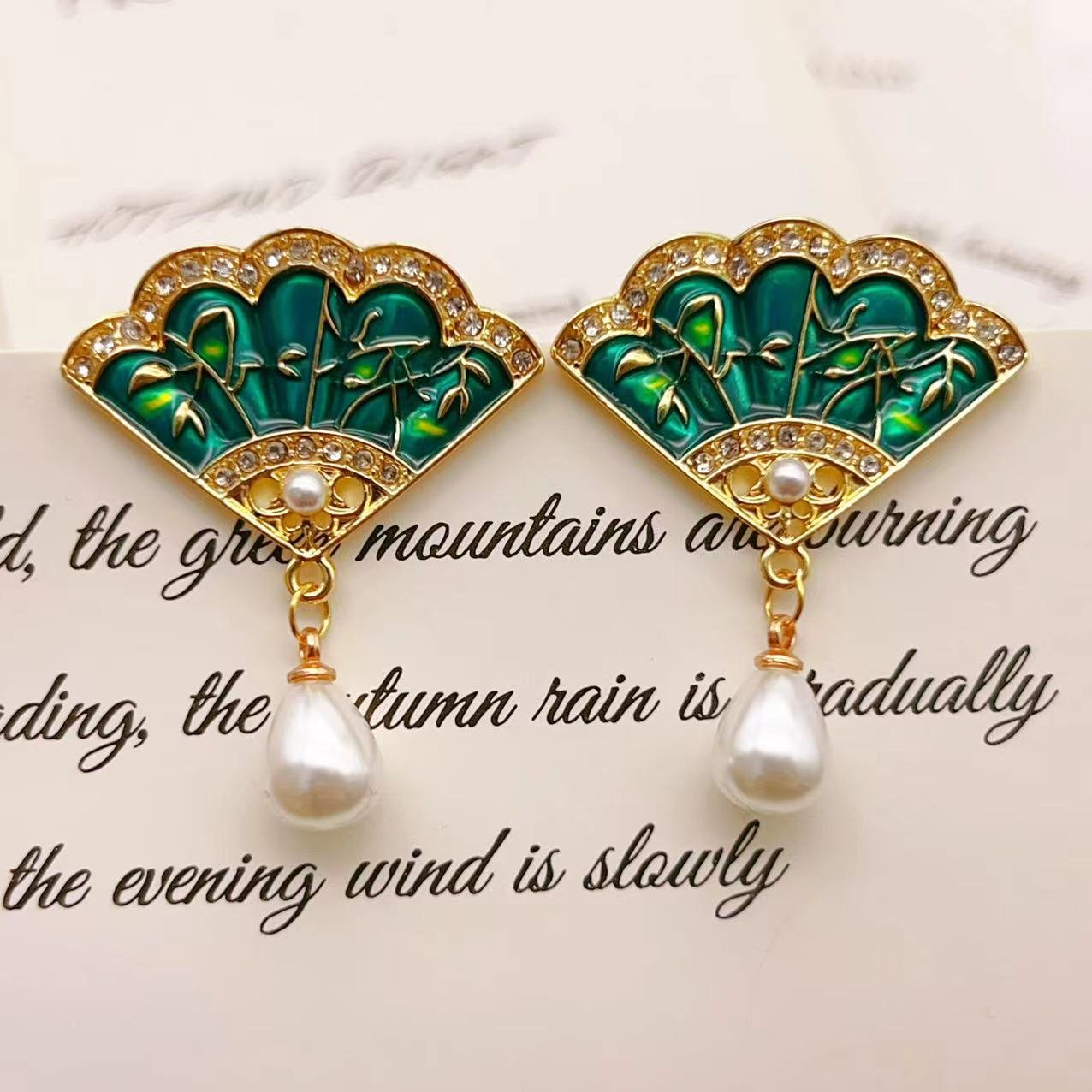 Vintage Enamel Glaze Fan-Shaped Imitation Pearl Earrings
