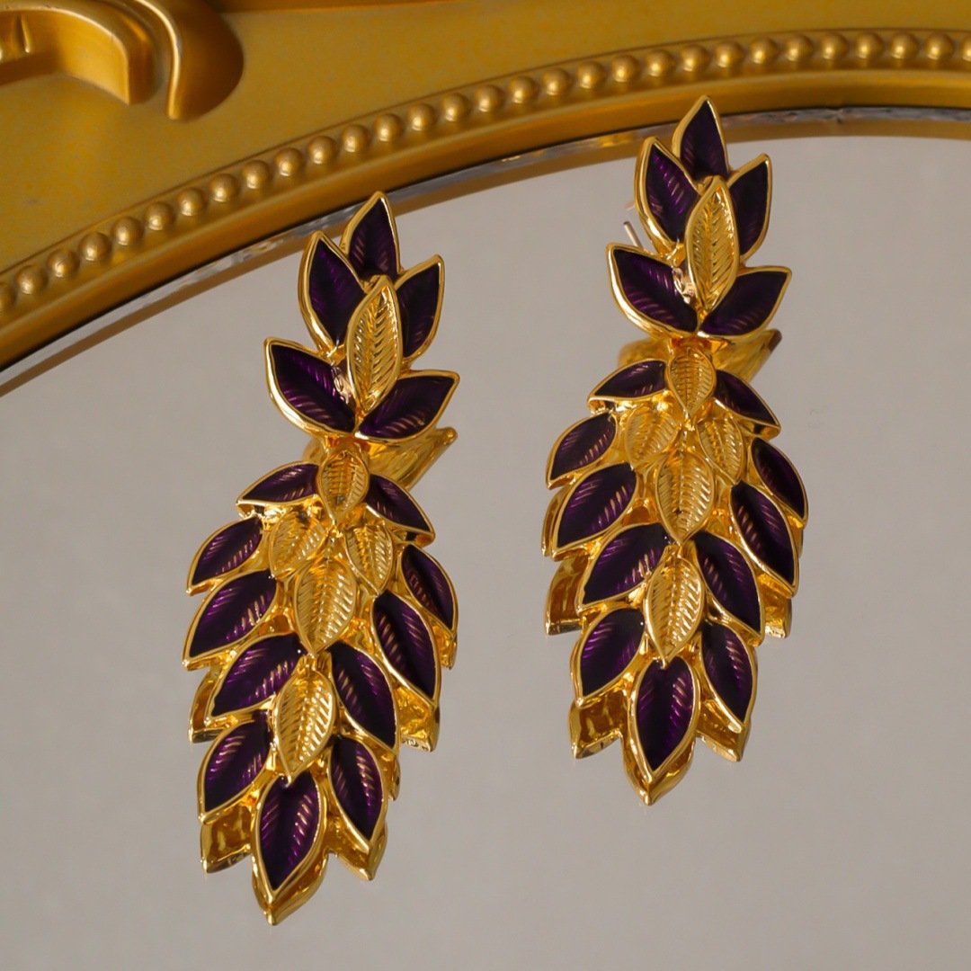 18K Gold Plated Vintage Long Purple Enamel Silver Post Part Earrings, Wheat Ear Tassel Earrings