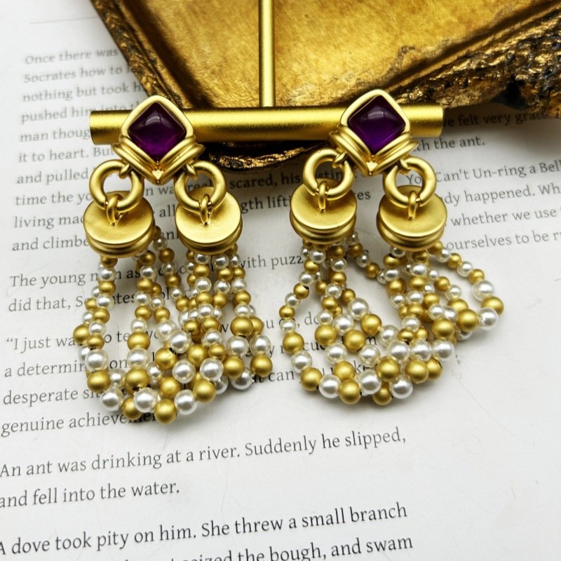 18K Gold Plated Vintage Multi-Layer Pearl Tassel Inlaid Amethyst Earrings 925 Silver Post Part Model