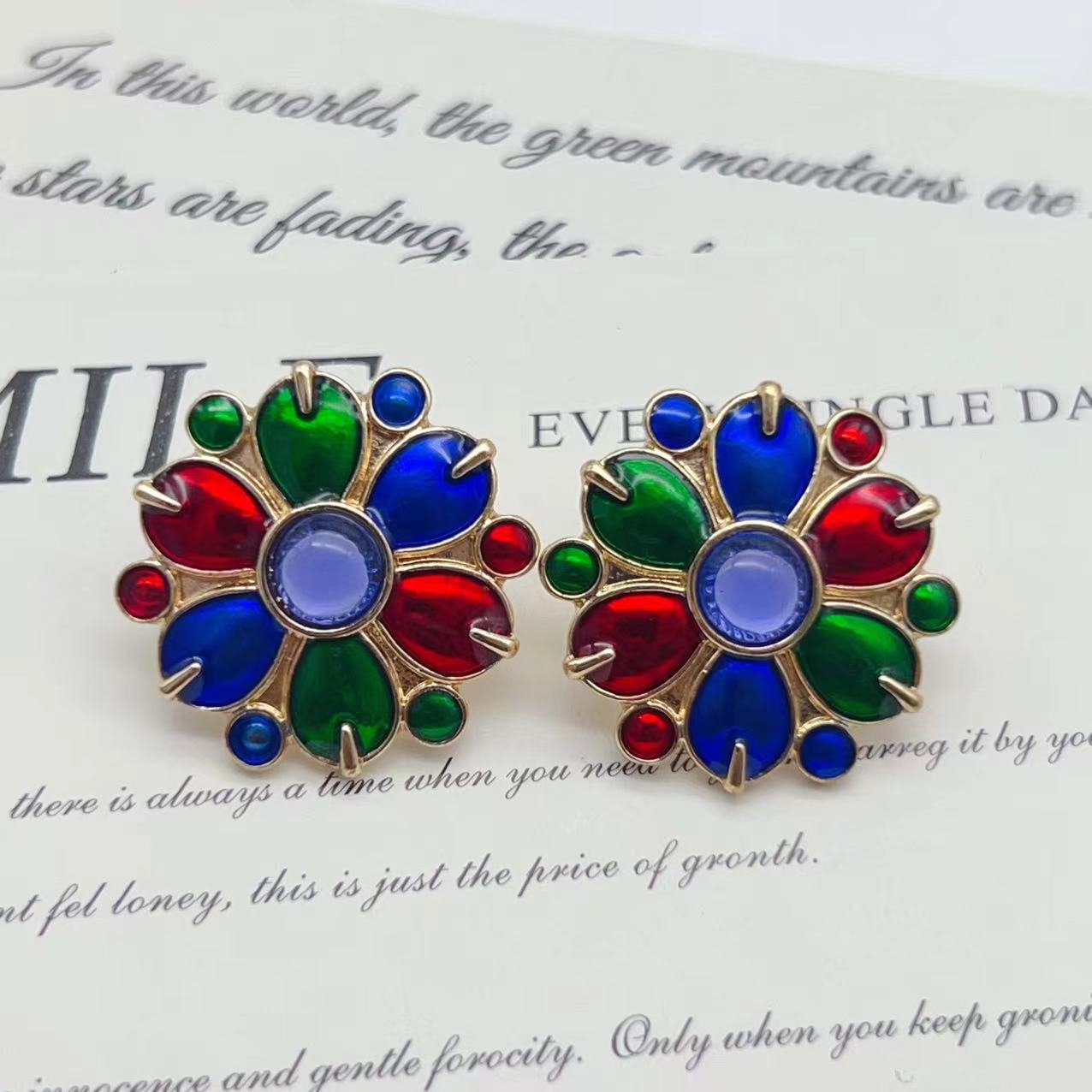 Vintage Red And Green Oil-Drip Enamel Flower Earrings