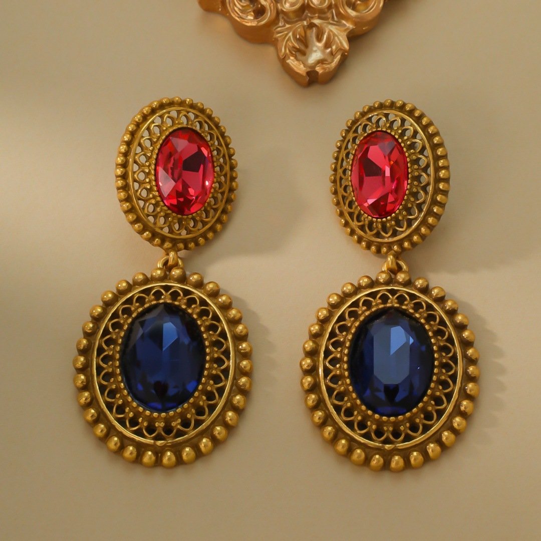 18K Gold Plated Vintage Spring Earrings Red And Blue Inlaid Gemstone Large Earrings quantity