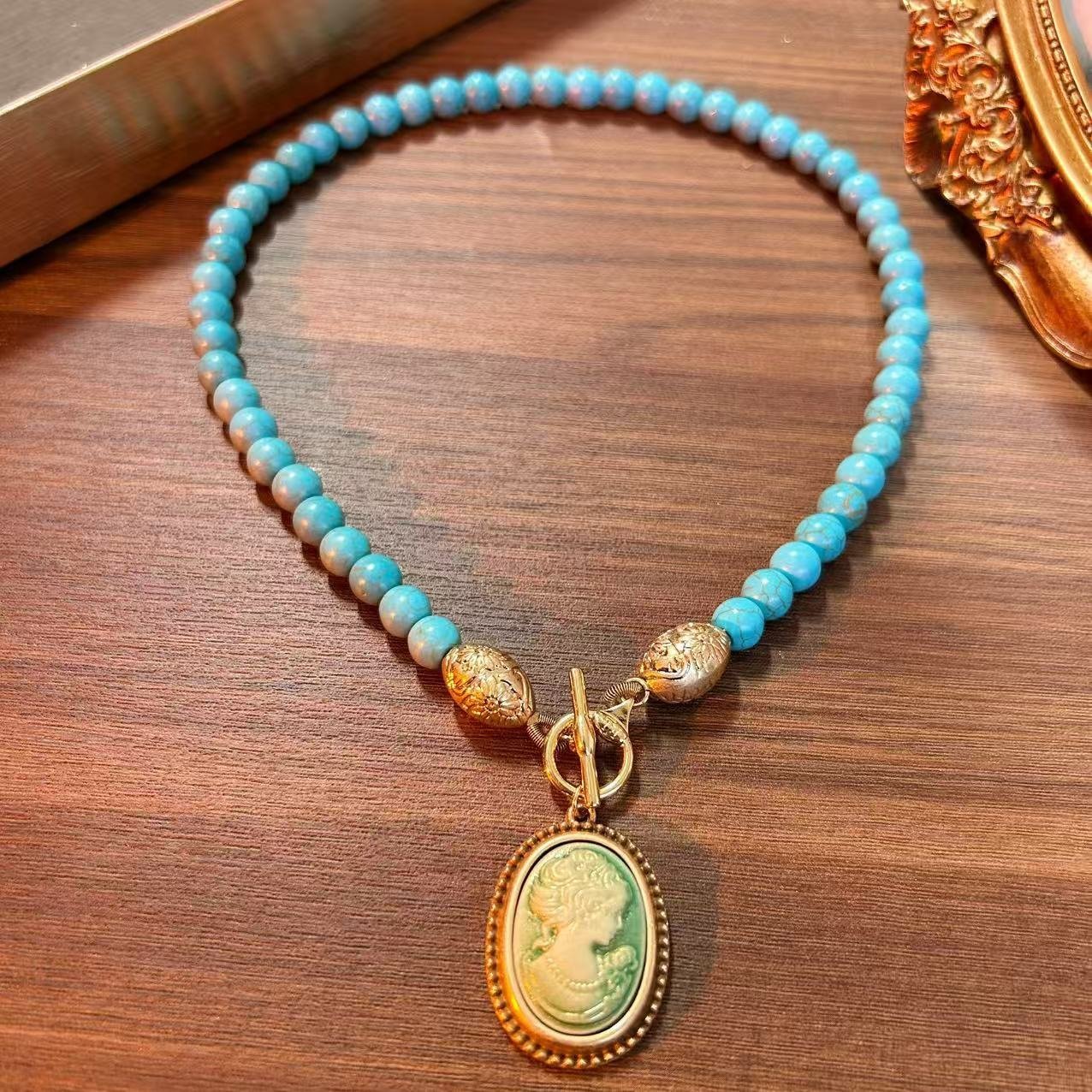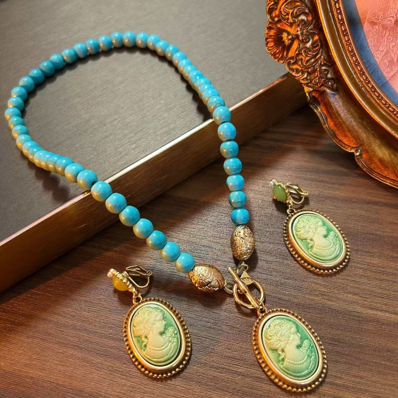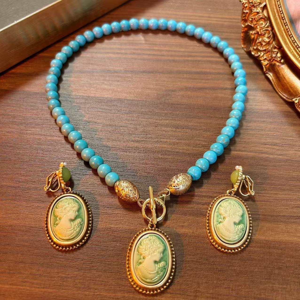 Vintage Style Cameo Style Turquoise Beads Chain Necklace / Dangle Ear Clips