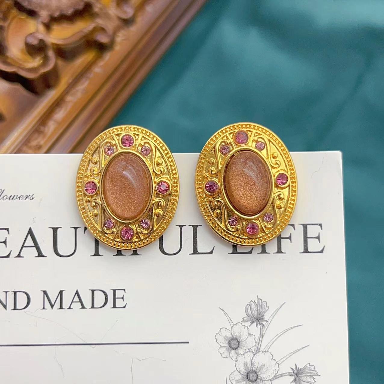 Vintage Three-Dimensional Relief Gold-Plated Oval Brown Earrings