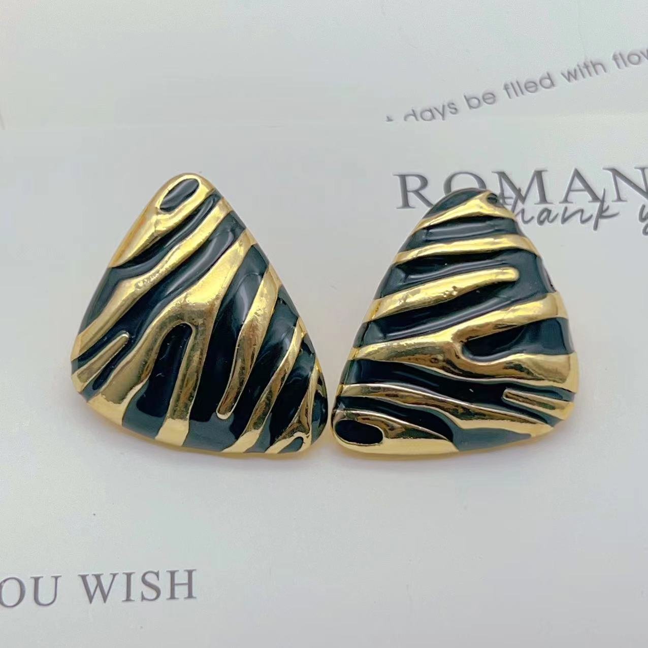 Vintage Twill Black And Gold Zebra Pattern Triangle Earrings For Women