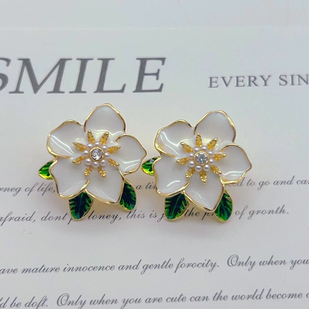 Vintage White Enamel Flower Green Leaf Earrings quantity